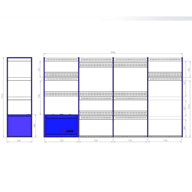 Комплект ЗМК 6.51.1716.2980.540 предназначен для комплексного оснащения сервисных автомобилей системой хранения инструмента с целью осуществления выездного сервиса, монтажа или ремонта. Используется в организациях, занимающихся ремонтом сельскохозяйственной и погрузочной техники, дорожно-ремонтных служб и других. Все элементы стеллажей изготовлены из высококачественной стали толщиной 1 мм. Рамы из профильной стальной трубы квадратного сечения 20х20 мм имеют порошковое полимерное покрытие синего цвета. Все выдвижные ящики, дверные блоки и откидные крышки оснащены специальными фиксаторами, которые не позволяют им выдвигаться и открываться при движении автомобиля. Шаг отверстий для крепления составляет 52 мм. Перфорированные стенки стеллажа позволяют фиксировать с помощью резиновых креплений вспомогательный инструмент или оборудование. Допустимая нагрузка на все ящики до 35 кг, на все полки до 50 кг, на столешницы до 100 кг. В комплект стеллажа входят все необходимые метизы, фиксаторы, кронштейны и усилители. Они поставляются в разобранном виде в надежной упаковке.