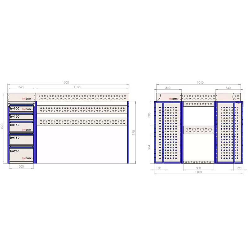 Комплект ЗМК 8.37.870.1500.1100 предназначен для комплексного оснащения сервисных автомобилей системой хранения инструмента с целью осуществления выездного сервиса, монтажа или ремонта. Используется в организациях, занимающихся ремонтом сельскохозяйственной и погрузочной техники, дорожно-ремонтных служб и других. Все элементы стеллажей изготовлены из высококачественной стали толщиной 1 мм. Рамы из профильной стальной трубы квадратного сечения 20х20 мм имеют порошковое полимерное покрытие синего цвета. Все выдвижные ящики, дверные блоки и откидные крышки оснащены специальными фиксаторами, которые не позволяют им выдвигаться и открываться при движении автомобиля. Шаг отверстий для крепления составляет 52 мм. Перфорированные стенки стеллажа позволяют фиксировать с помощью резиновых креплений вспомогательный инструмент или оборудование. Допустимая нагрузка на все ящики до 35 кг, на все полки до 50 кг, на столешницы до 100 кг. В комплект стеллажа входят все необходимые метизы, фиксаторы, кронштейны и усилители. Они поставляются в разобранном виде в надежной упаковке.