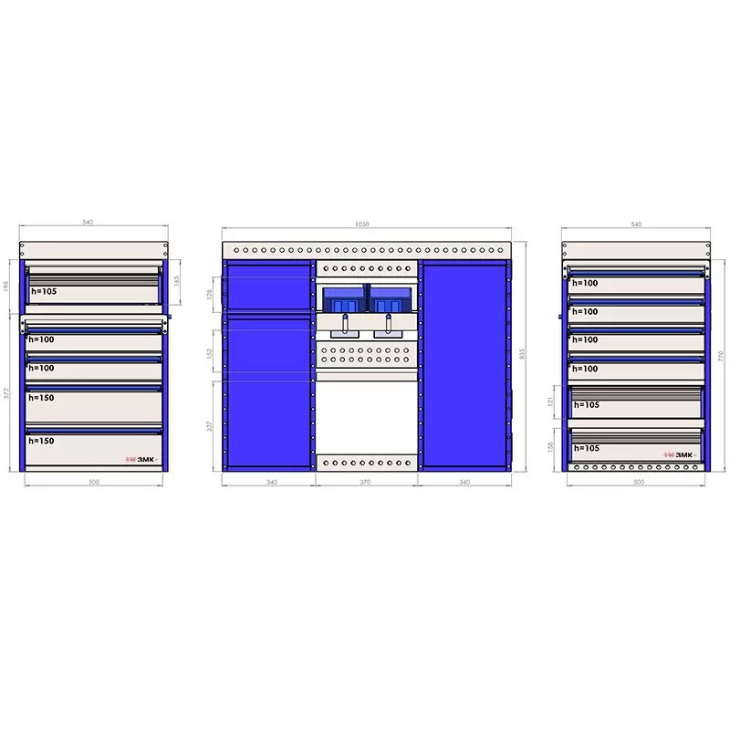 Комплект ЗМК 8.44.835.1050.540 предназначен для комплексного оснащения сервисных автомобилей системой хранения инструмента с целью осуществления выездного сервиса, монтажа или ремонта. Используется в организациях, занимающихся ремонтом сельскохозяйственной и погрузочной техники, дорожно-ремонтных служб и других. Все элементы стеллажей изготовлены из высококачественной стали толщиной 1 мм. Рамы из профильной стальной трубы квадратного сечения 20х20 мм имеют порошковое полимерное покрытие синего цвета. Все выдвижные ящики, дверные блоки и откидные крышки оснащены специальными фиксаторами, которые не позволяют им выдвигаться и открываться при движении автомобиля. Шаг отверстий для крепления составляет 52 мм. Перфорированные стенки стеллажа позволяют фиксировать с помощью резиновых креплений вспомогательный инструмент или оборудование. Допустимая нагрузка на все ящики до 35 кг, на все полки до 50 кг, на столешницы до 100 кг. В комплект стеллажа входят все необходимые метизы, фиксаторы, кронштейны и усилители. Они поставляются в разобранном виде в надежной упаковке.